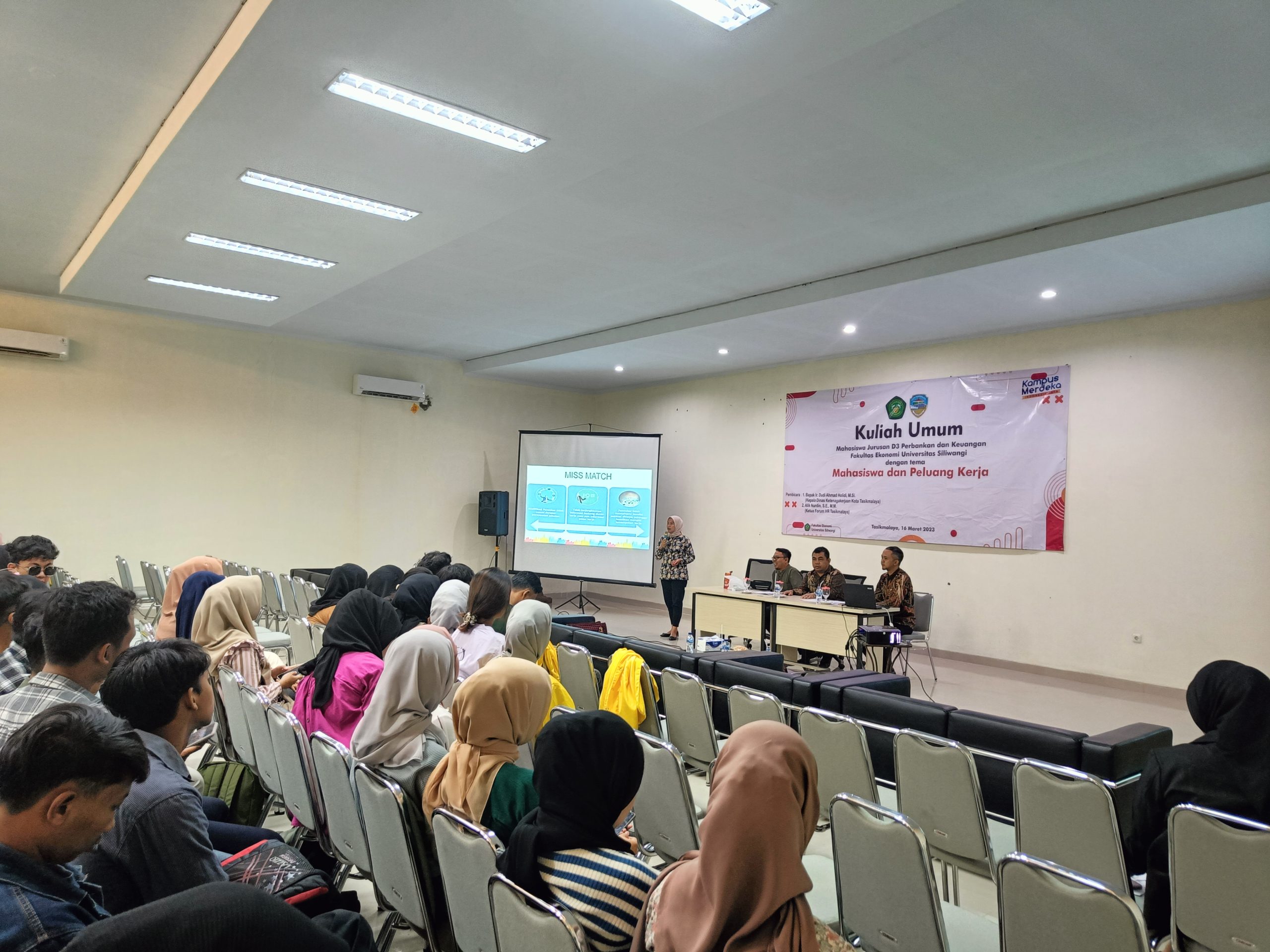 Kamis, 16 Maret 2023 telah dilaksanakan Kuliah Umum Jurusan Perbankan Fakultas Ekonomi Universitas Siliwangi dengan tema Mahasiswa dan Peluang Kerja dengan Pemateri dari Dinas Ketenagakerjaan Kota Tasikmalaya yaitu Bapak Ir. Dudi Ahmad Holidi, M.Si. selaku Kepala Dinas, Ibu Dewi Partiasari Sutarya, S.H., dan Bapak Alik Nurdin, S.E., M.M. sebagai Ketua HR Kota Tasikmalaya.
